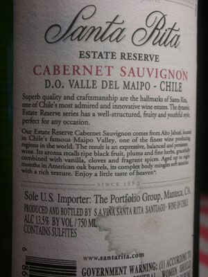 Santa Rita is a chilean cabernet. This bottle has been sitting a few years. Something about this wine that gives you a rich feeling of good.