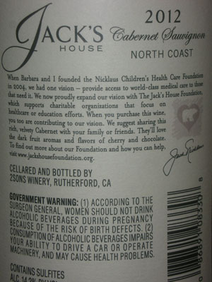 Famous golfer putts his signature on this wine quite aptly. Portion of earnings goto Jack's House Foundation which supports healtcare and education efforts.